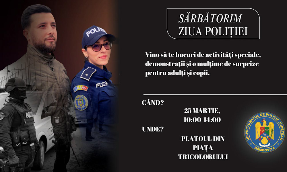 IPJ Dâmboviţa organizează, mâine – 25 martie 2024, de „Ziua Poliției Române”, demonstrații pentru public și diferite alte activități specifice. Evenimentul, care se va consuma între...